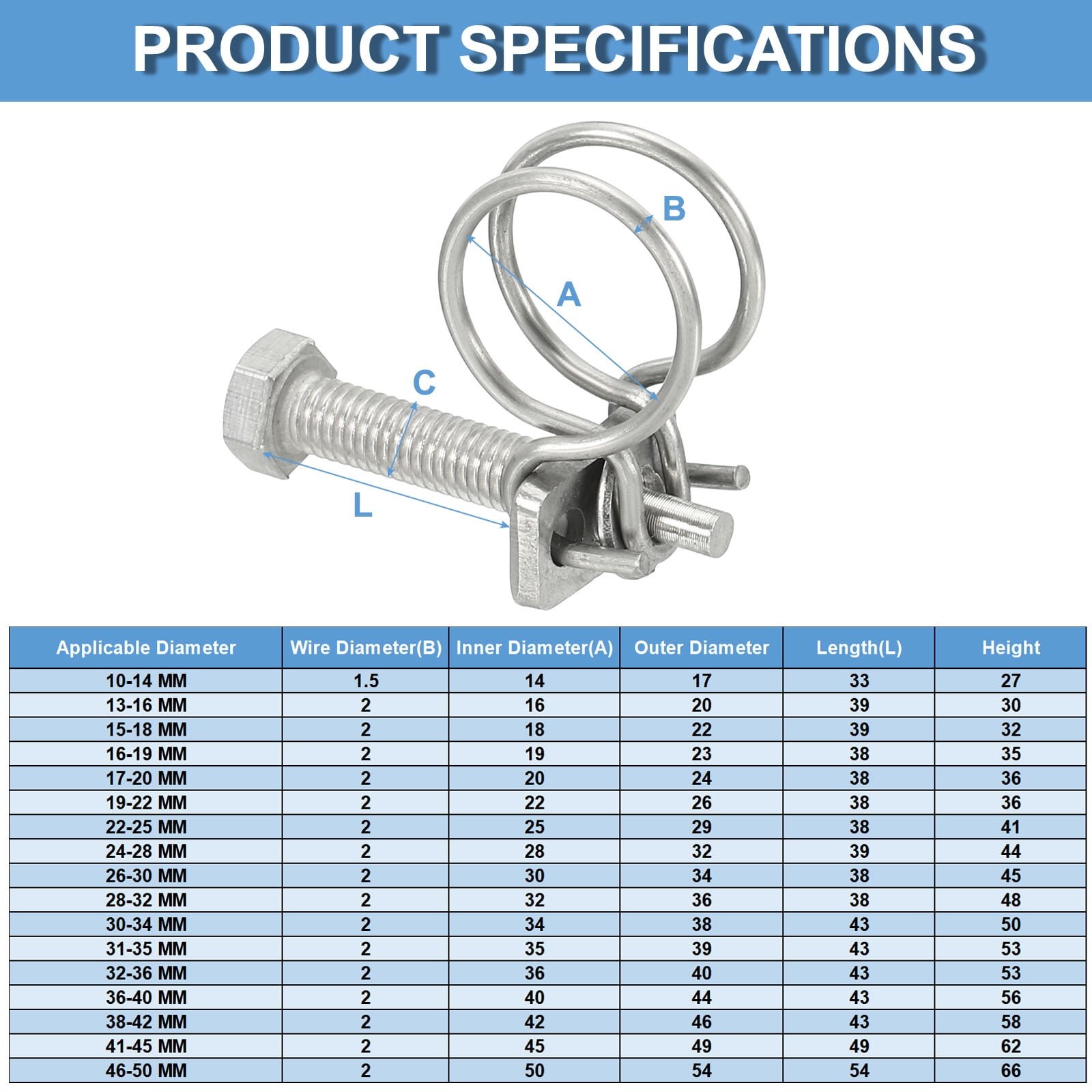 These hose clamps are made of stainless steel and surface polishing to protect against corrosion. The clamps are made with a double-wire design, smooth edges of the round wire, and feature a screw that provides strong clamping, which can be used for long-time fastening.